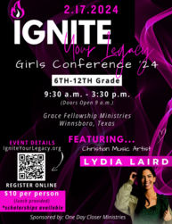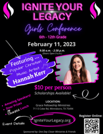 The IGNITE YOUR LEGACY Girls Conference is a powerful event, full of energy and excitement as we encourage young ladies (Grades 6th - 12th), to leave a legacy that ignites and inspires others to be a follower of Jesus. Our desire is for all young ladies to recognize their value as a special individual created to have a unique and divine purpose.